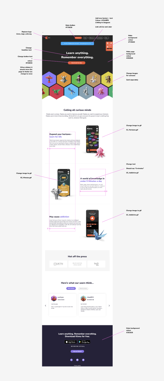 I designed multiple websites for Kinnu, from the main site to landing pages for testing, liaising with an off-shore team for development.